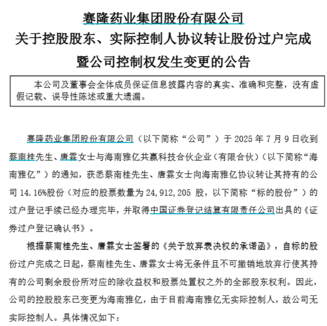 7月9日公告显示,塞隆药业已收到蔡南桂、唐霖与海南雅亿的通知,获悉蔡南桂、唐霖向海南雅亿协议转让其持有的公司14.16%股份的过户登记手续已经办理完毕,并取得中国证券登记结算有限责任公司出具的《证券过户登记确认书》。根据蔡南桂、唐霖签署的《关于放弃表决权的承诺函》,自标的股份过户完成之日起,蔡南桂、唐霖将无条件且不可撤销地放弃行使其持有的塞隆药业剩余股份所对应的除收益权和股票处置权之外的全部股东权利。因此,塞隆药业的控股股东已变更为海南雅亿,由于目前海南雅亿无实际控制人,故塞隆药业无实际控制人。