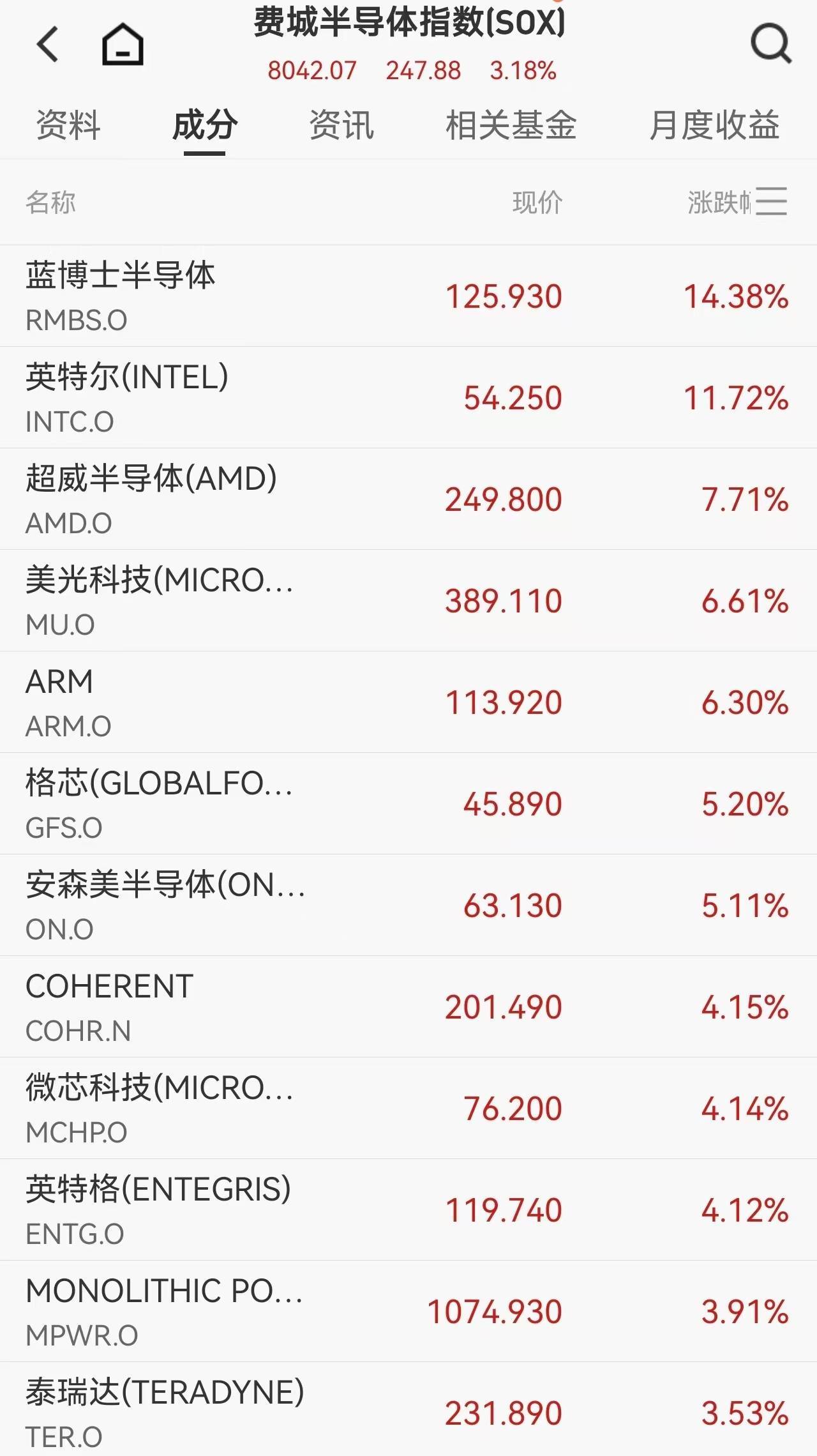 板块表现方面,科技股成为反弹主力。存储芯片概念股集体爆发,费城半导体指数大涨3.18%至8042.07点,英特尔涨近12%收于 54.25美元,闪迪涨超10%,2026年迄今累计涨幅已超111%,西部数据、美光科技分别上涨8%和6%。
