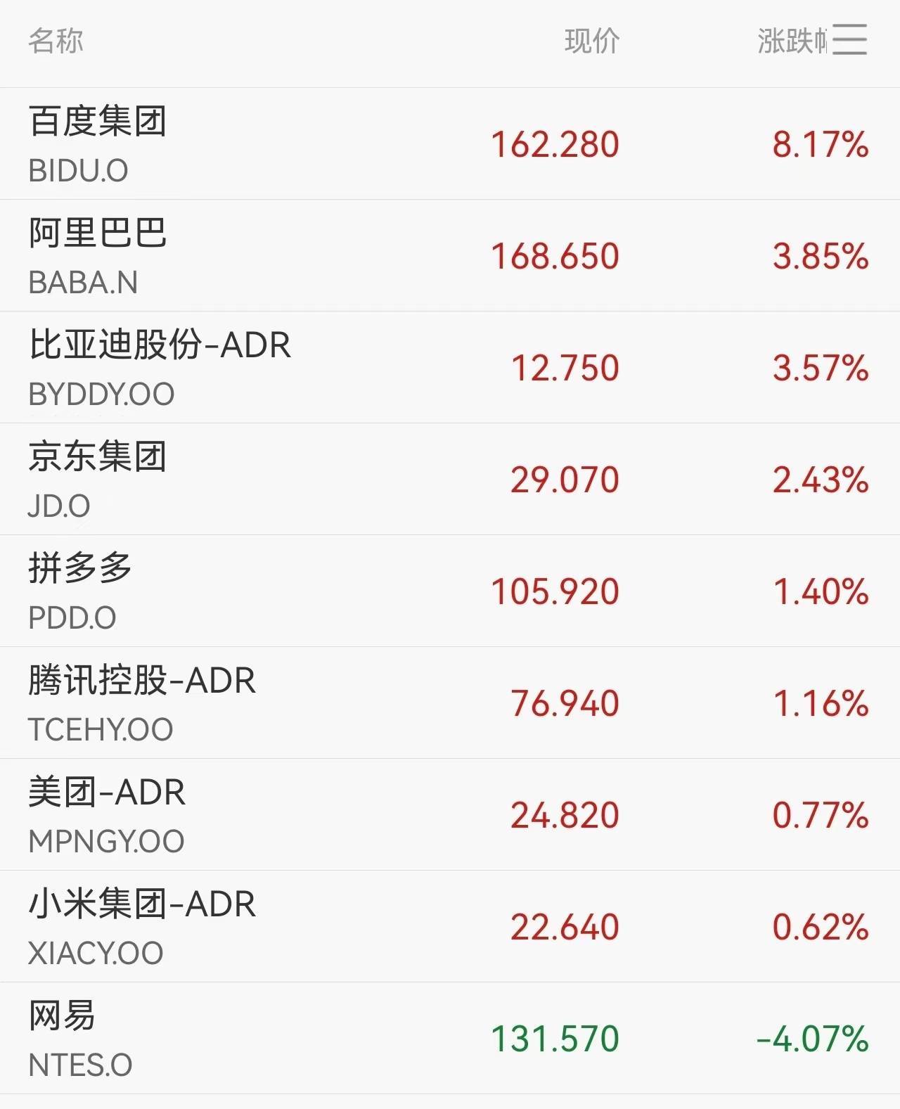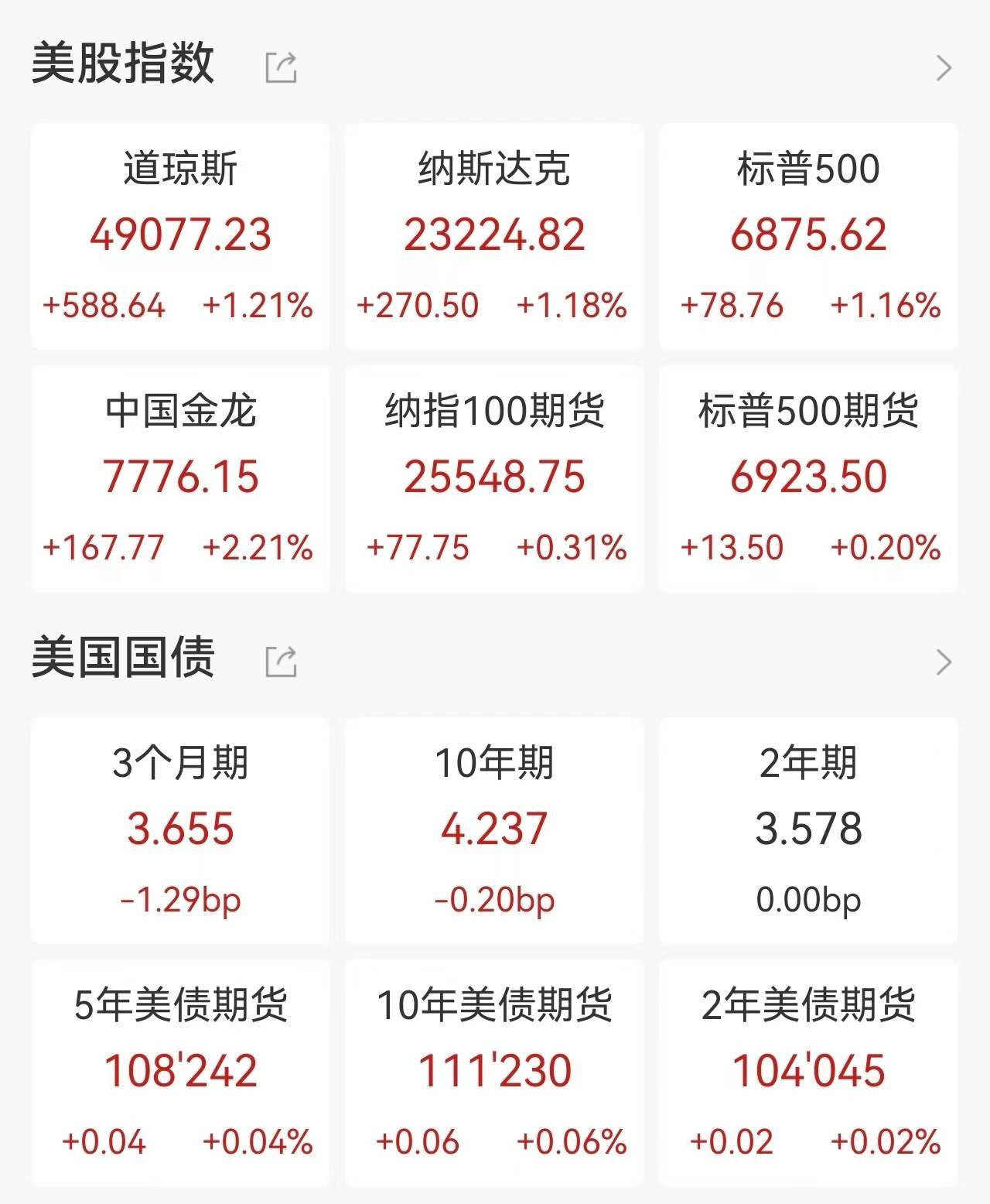 中概股阵营同步走强,纳斯达克中国金龙指数收涨2.21%报7776.15 点。个股方面,百度涨超8%,世纪互联、万国数据涨超 6%,哔哩哔哩涨超5%,阿里巴巴涨3.9%,拼多多涨1.4%,新氧更是以14.55% 的涨幅领涨中概股。这一表现反映出市场风险偏好回升背景下,中国资产的估值修复需求。